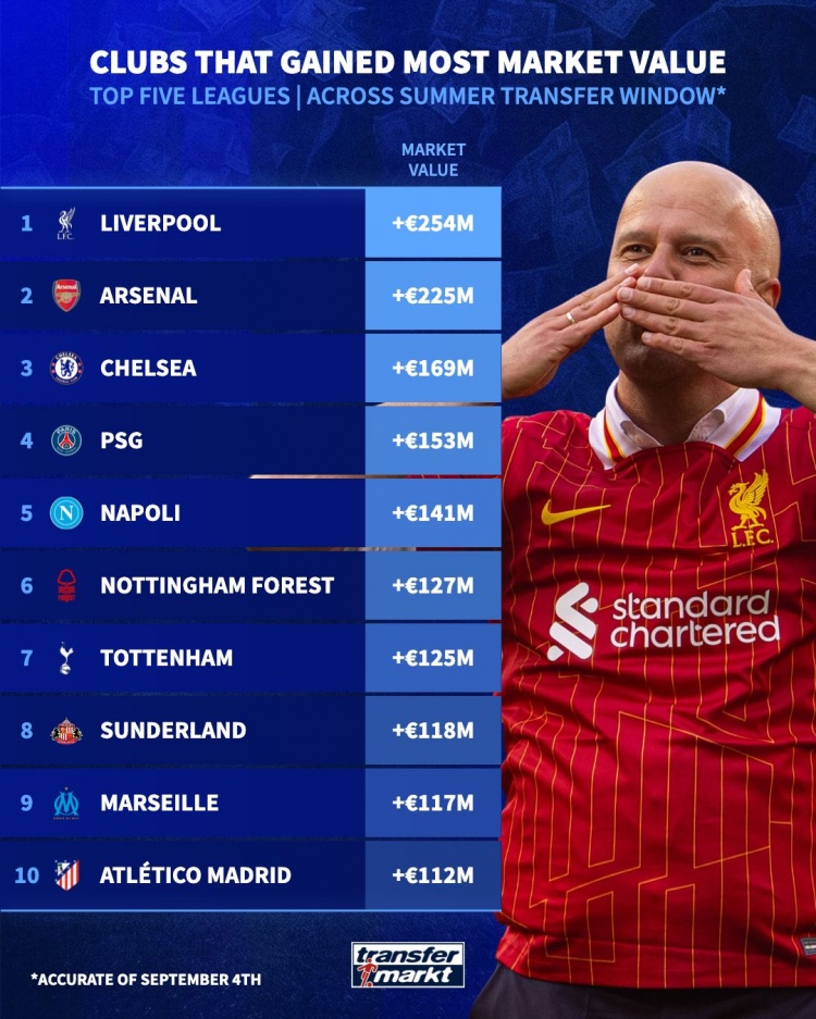 9月5日,2025年欧洲五大联赛夏季转会窗口正式关闭。德国转会市场随后公布了夏窗结束后俱乐部全队身价涨幅榜单,其中利物浦以2.54亿欧元的增长幅度位居榜首。球队身价上涨的原因包括新援加盟以及原有球员身价提升。