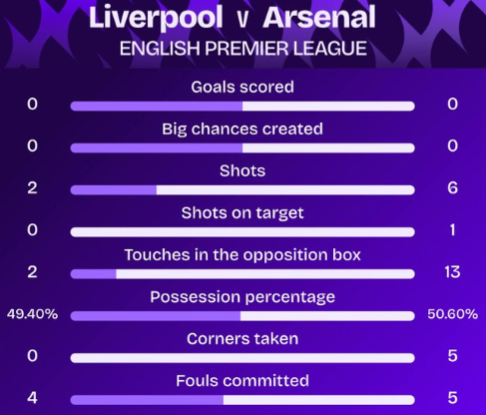 在利物浦和阿森纳的上半时比赛里,两队在场上踢得较为沉闷,双方比分打成0-0。纵观这场比赛的上半时,双方皆难以创造具有威胁的攻势,在射门方面,阿森纳以6-2领先;在射正方面,阿森纳以1-0占优。