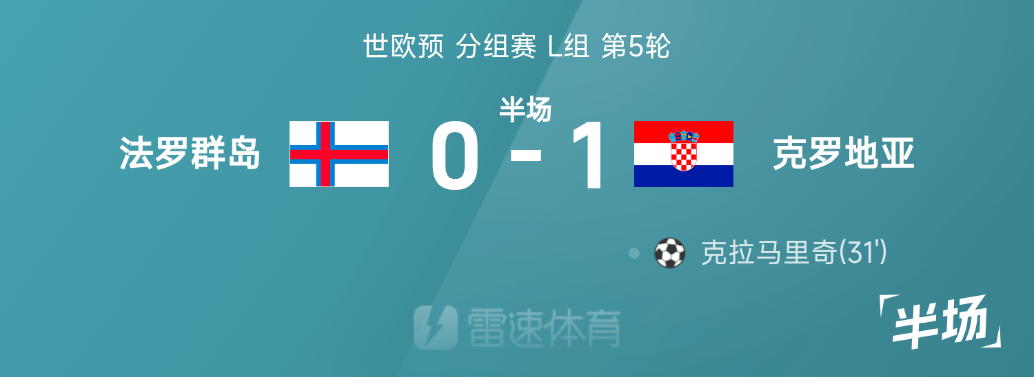 09月06日讯 26赛季世欧预分组赛L组第5轮,法罗群岛迎战克罗地亚。半场战罢,双方比分暂为法罗群岛0-1克罗地亚,克拉马里奇破门建功。